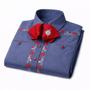 Authentic Charro long-sleeve shirt with Charro-style buttons and a tailored, comfortable fit. Features detailed traditional embroidery on the front and back, ideal for Charrería events, Charreadas, and cultural celebrations.