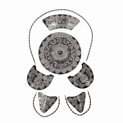 Herraje de acero inoxidable para montura charra de (9) piezas grabadas a mano que incluyen: 1 Disco para la cabeza de la montura 2 Medias Lunas 2 T...