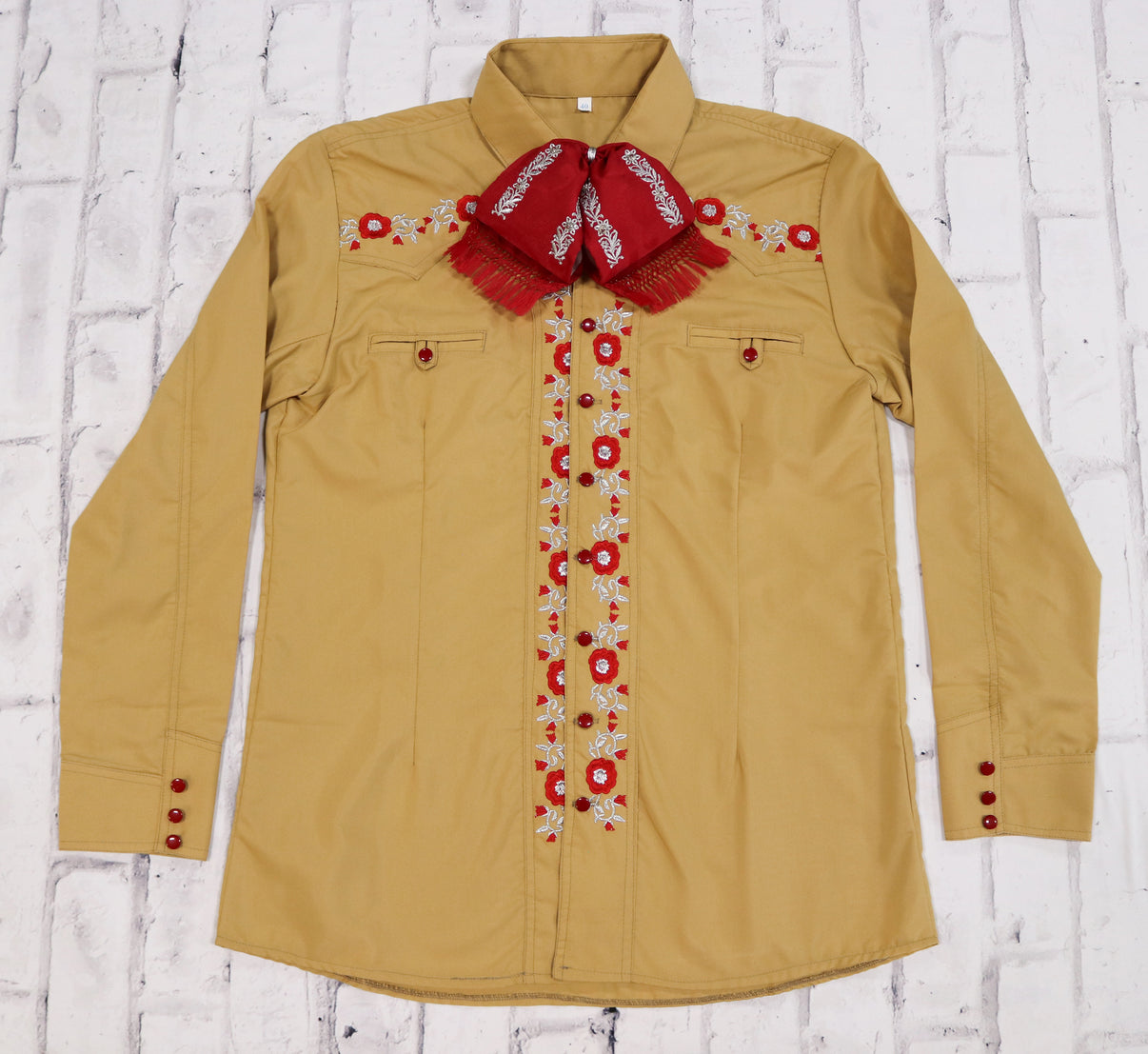 Charro Shirt with unique buttons. Its had a beautiful traditional embroidery on both front sides, down the middle, and back.
