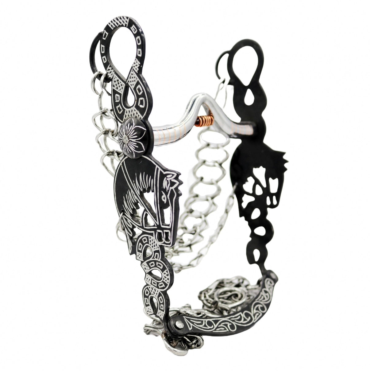 This authentic custom design stainless steel charro horse bit with copper mouth. Includes a complete set of cadenilla chains.
