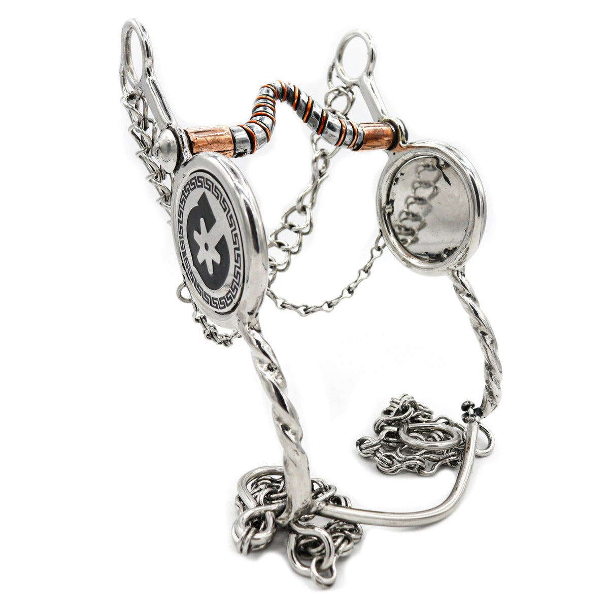Stainless Steel Bit with Low/Medium port comes with complete charro chain set. Handemade in Mexico with unique Charro design, features copper rollers 5" mouth and 9" length.