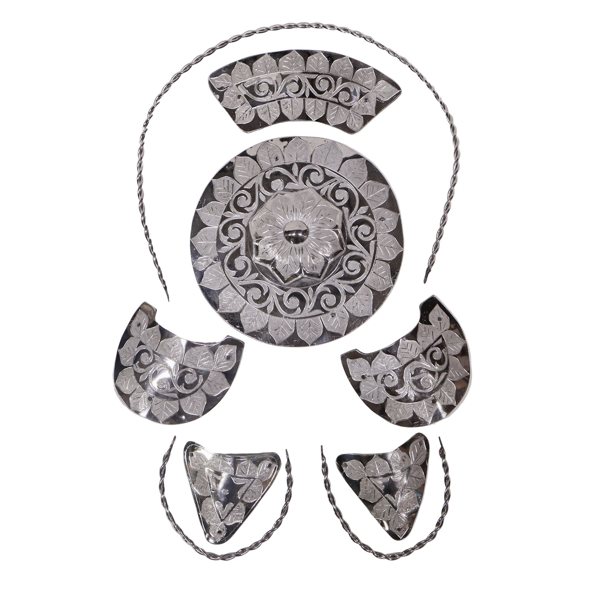 Juego de Medio Fuste En Acero Inoxidable para montura charra mexicana. Incluye 9 piezas grabadas a mano, ideal para dar un toque auténtico y tradicional. Hecho en México, resistente y diseñado solo para montura charra.
