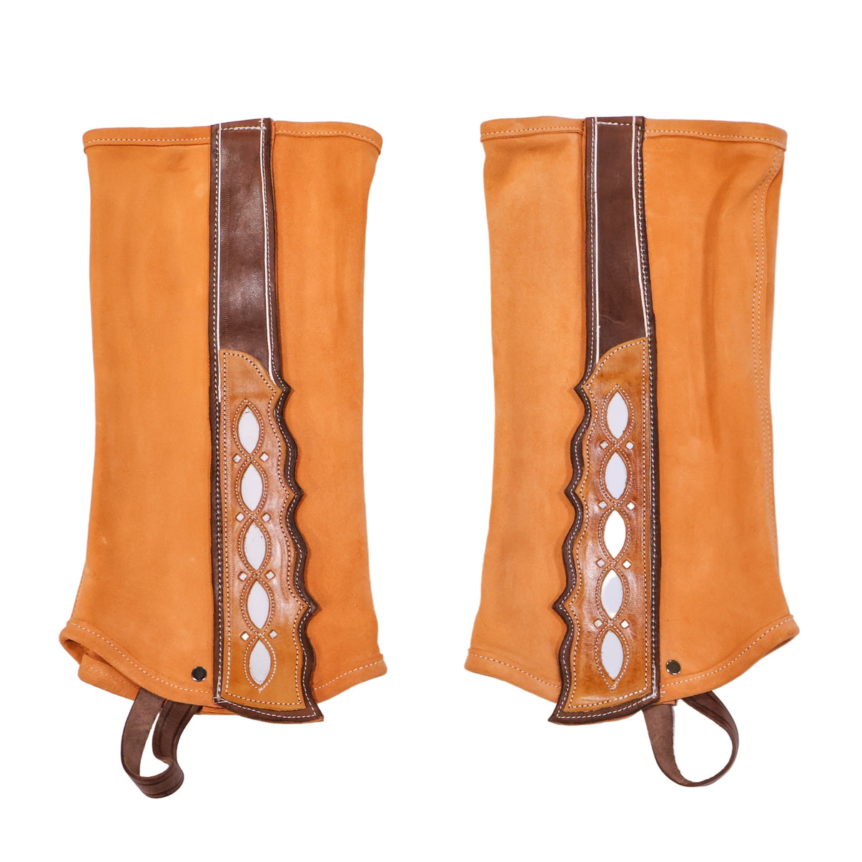 Soft Leather leggings featuring Velcro closures with beautiful custom design. Very comfortable and easy to take on and off, adjustable. Made in Mexico. Polainas de piel con cierres de velcro con diseño al lado. Muy cómodo y fácil de poner y quitar.