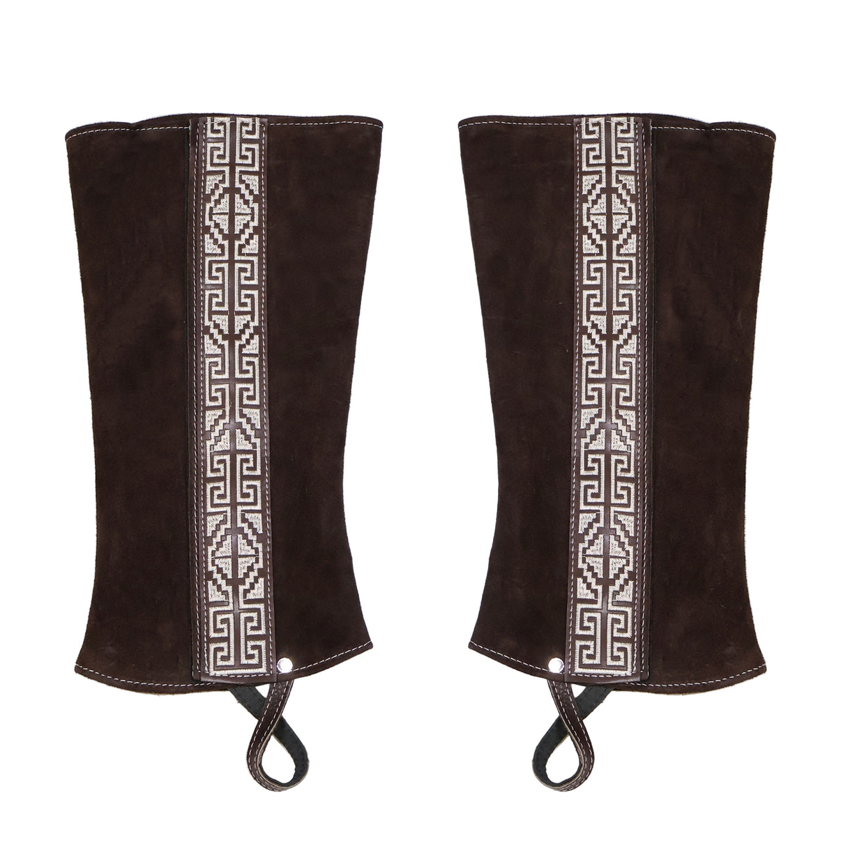 Soft Leather leggings featuring Velcro closures with beautiful custom design. Very comfortable and easy to take on and off, adjustable. Made in Mexico. Polainas de piel con cierres de velcro con diseño al lado. Muy cómodo y fácil de poner y quitar. Measurements: Size: Medium (mediano) Length(largo): 16" Width: Adjustable (16"- 18")